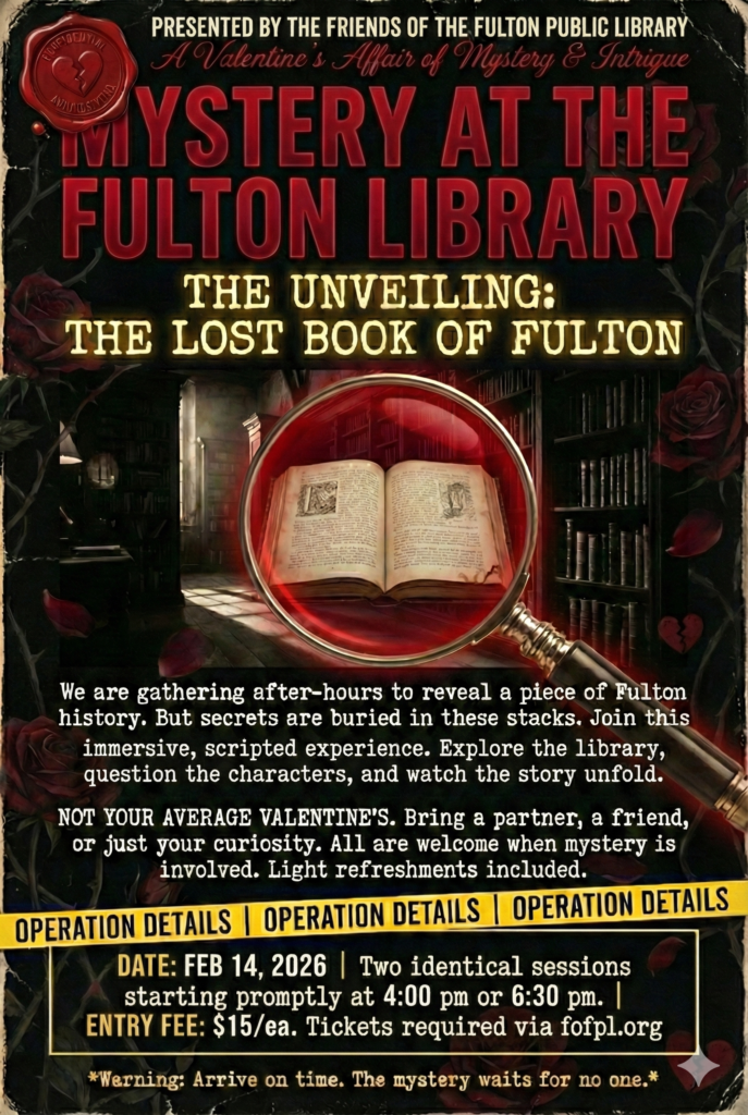 Step inside the historic Fulton Public Library after hours for an evening where the stacks hold more than just stories. The Friends of the Fulton Library invite you to The Unveiling: The Lost Book of Fulton, an immersive, scripted mystery experience designed for the curious and the adventurous.